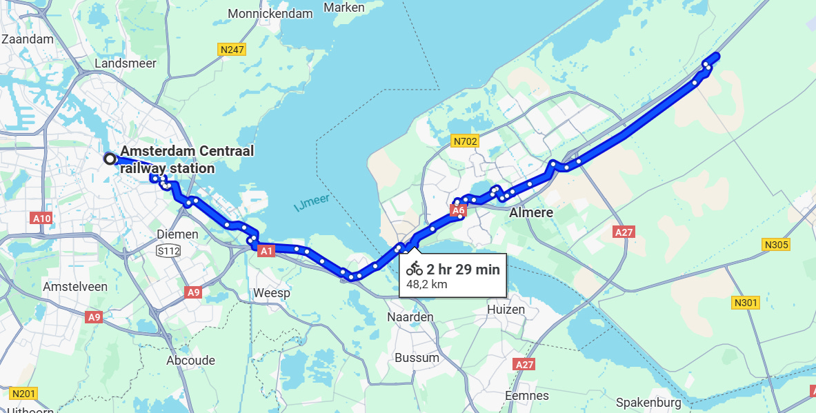 Dennoch war ich in so eine Art Verleugnungsphase und redete mir ein, dass die kleinen Namen auf der Karte STADTVIERTEL seien und dass das Hotel DOCH in Amsterdam liege. Die angegebenen 48,2 km auf der Karte waren auch nicht überzeugend genug, um mich dazu zu bringen, meine eigene Logik in Frage zu stellen. Zu unserem Glück gab es einen INTERCITY – ja, nicht einmal die Tatsache, dass das Ding InterCITY hieß, war offensichtlich genug –, der etwa 10 km vor dem Hotel hielt – und obwohl ich Radfahrerin bin, hatte ich keine Ahnung, wie viel 10 km in der Praxis sind. Google Maps schlug vor, die Strecke mit einem Uber zu beenden, was etwa 10 € kosten würde. Okay, gut, dachten wir. Ohne Karl die genaue Entfernung zwischen dem Bahnhof und unserem Hotel zu sagen, listete ich einfach nur die Strecke auf, die wir zurücklegen sollten, damit es irgendwie nach einem vernünftigen, angemessenen Plan klang.
